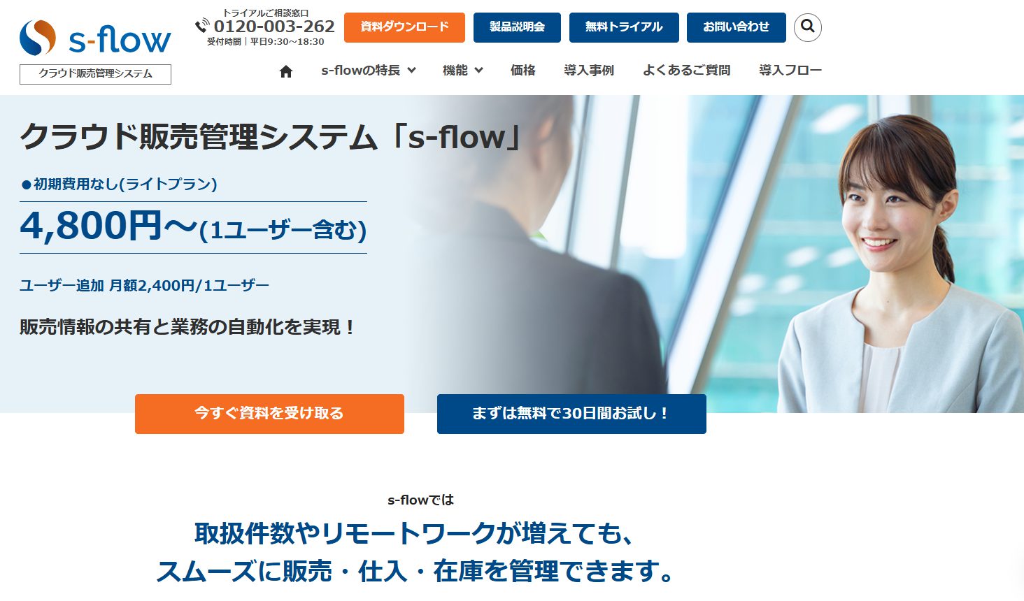 クラウド販売管理システム「s-flow」は「クラウド × 低コスト × 導入しやすさ」の3軸で最もバランスがよい中小企業向けのシステムです。